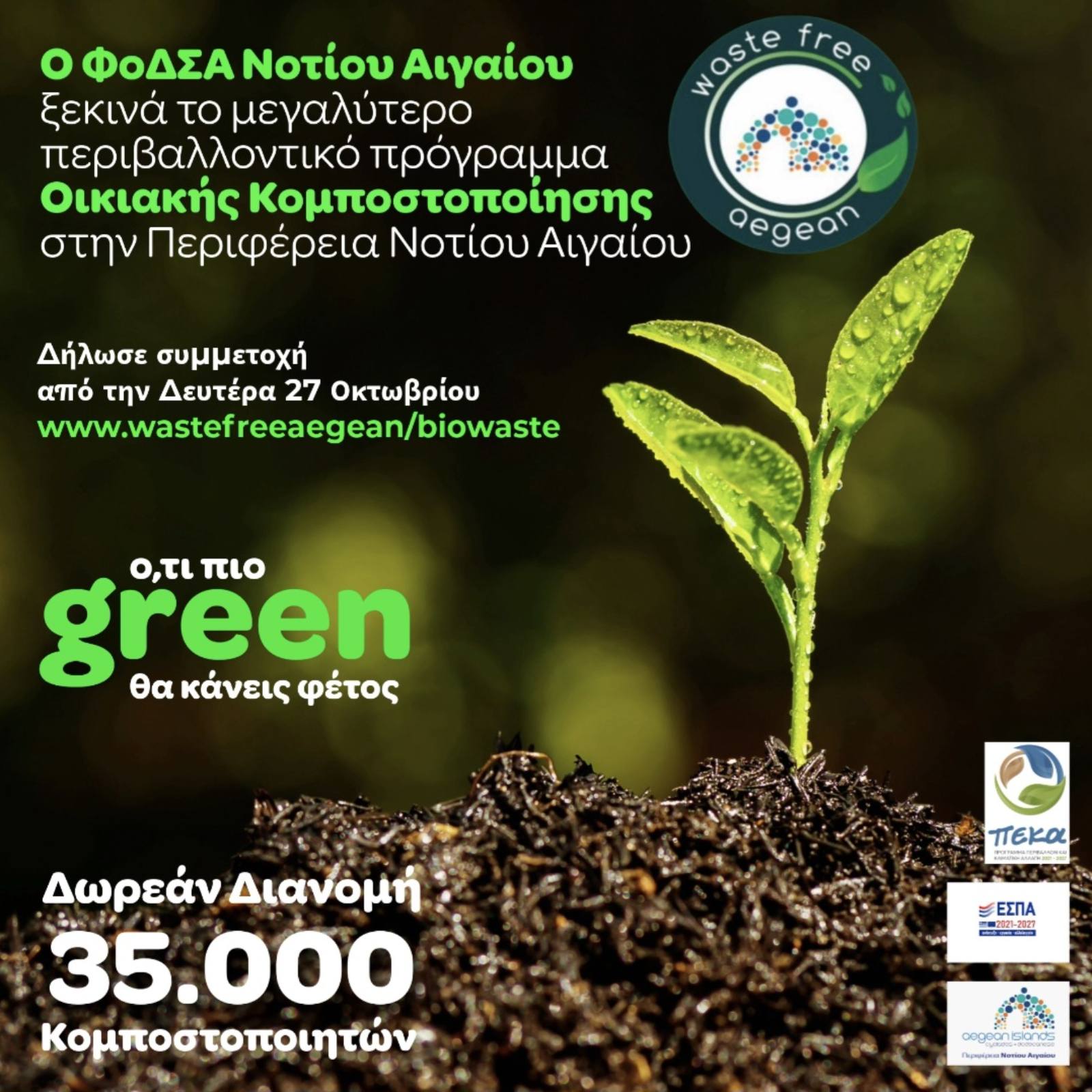 Ο ΦοΔΣΑ Νοτίου Αιγαίου ξεκινά το μεγαλύτερο περιβαλλοντικό πρόγραμμα Οικιακής Κομποστοποίησης στην Περιφέρεια Νοτίου Αιγαίου, με τη δωρεάν διανομή 35.000 κομποστοποιητών σε νοικοκυριά.